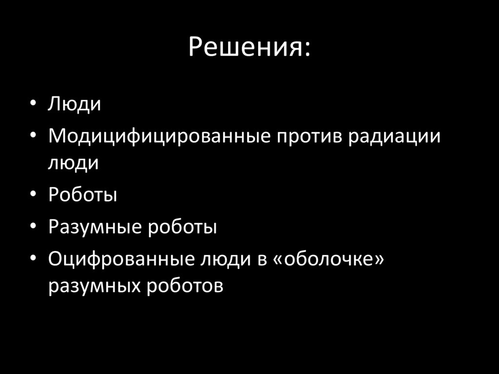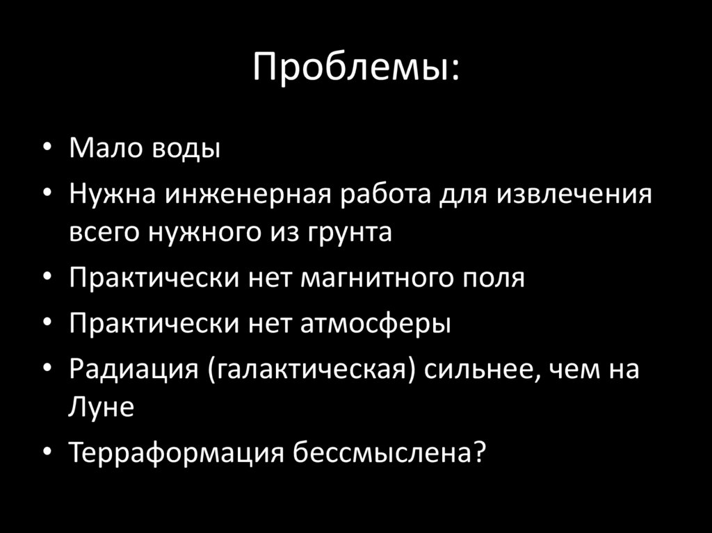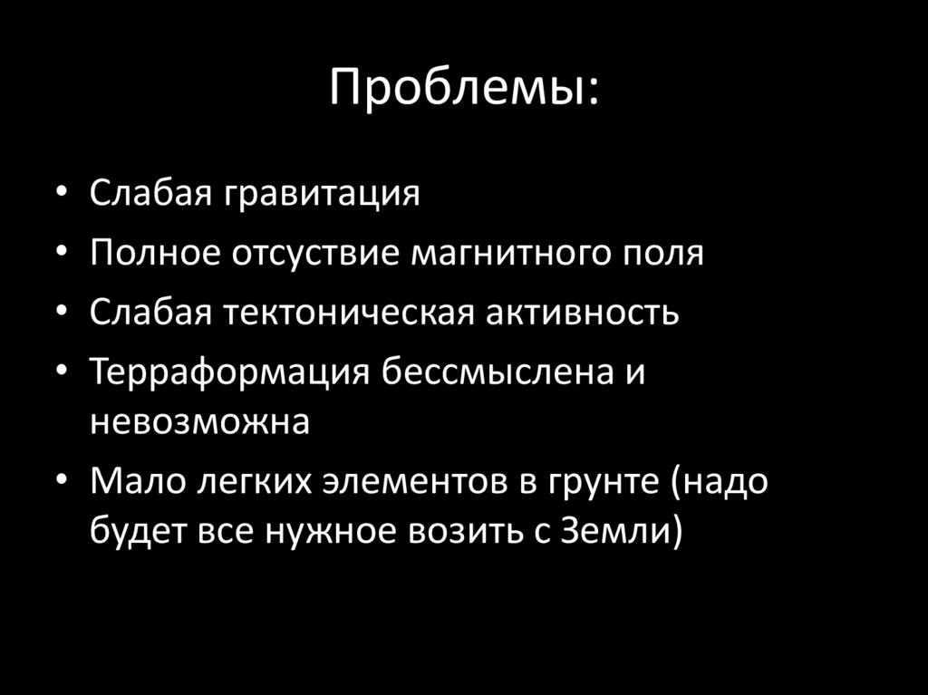 Проблемы:• Радиация (можно слать только роботов или