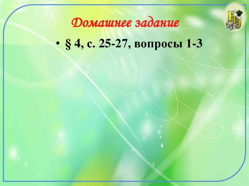 Домашнее задание• § 4, с. 25-27, вопросы 1-3