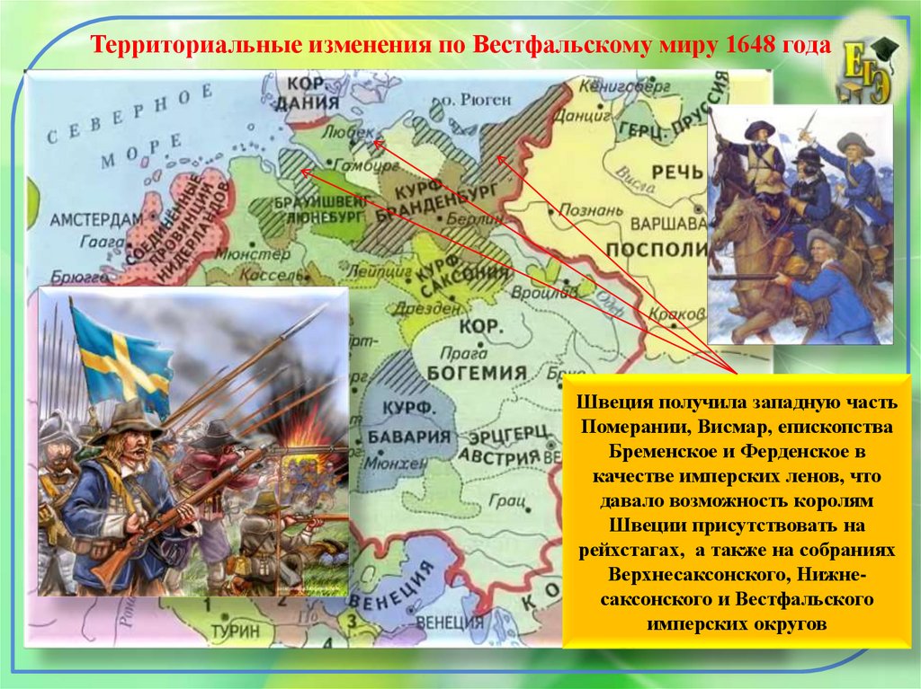 Территориальные изменения по Вестфальскому миру 1648 годаШвеция получила западную часть