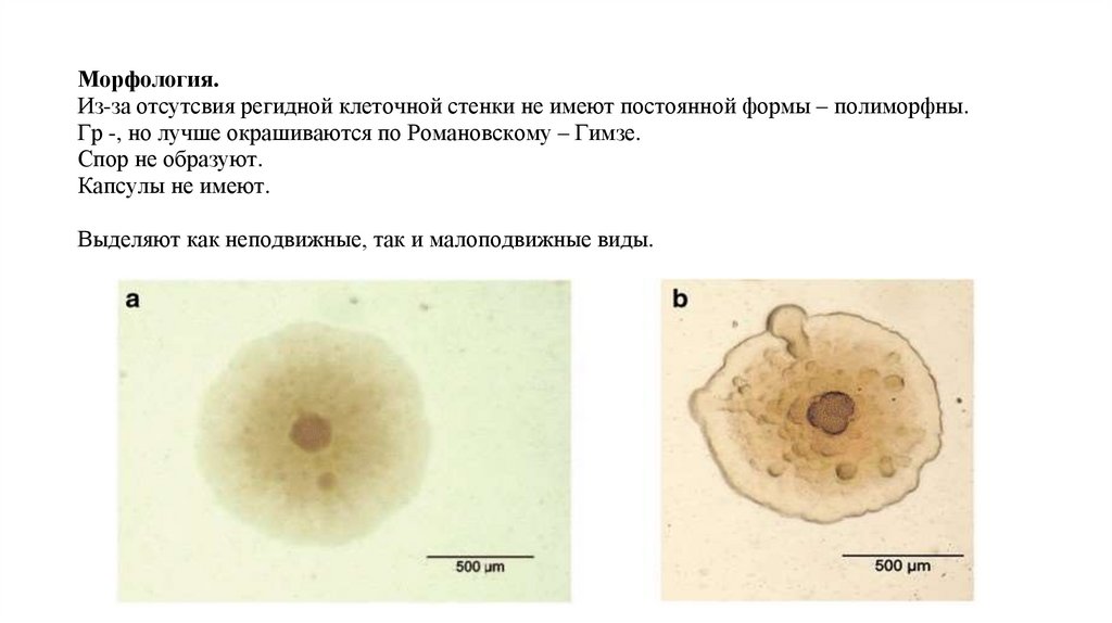Морфология.Из-за отсутсвия регидной клеточной стенки не имеют постоянной формы – полиморфны.