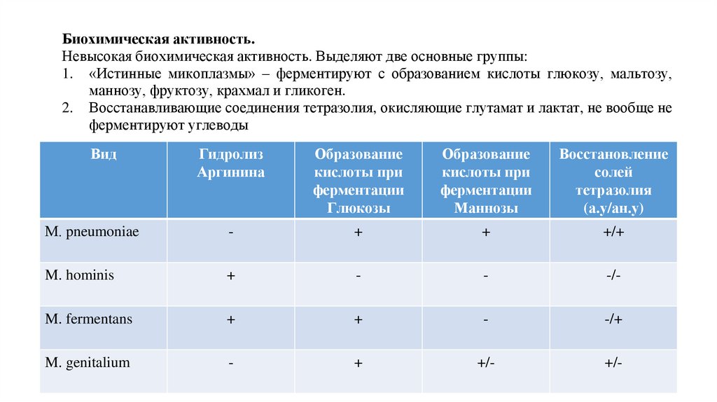 1. «Истинные микоплазмы» – ферментируют с образованием кислоты глюкозу, мальтозу,