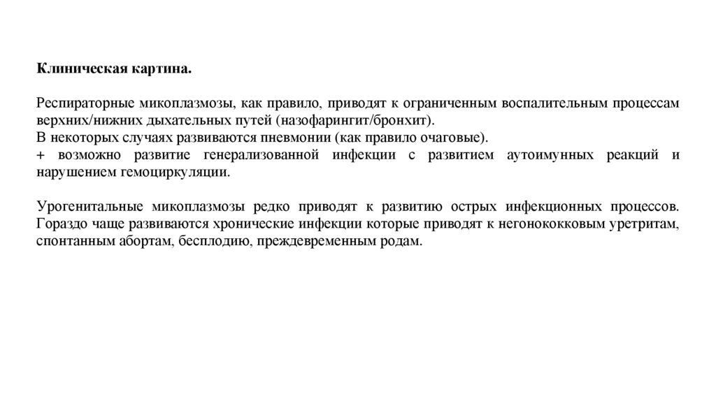 Клиническая картина.Респираторные микоплазмозы, как правило, приводят к ограниченным воспалительным процессам