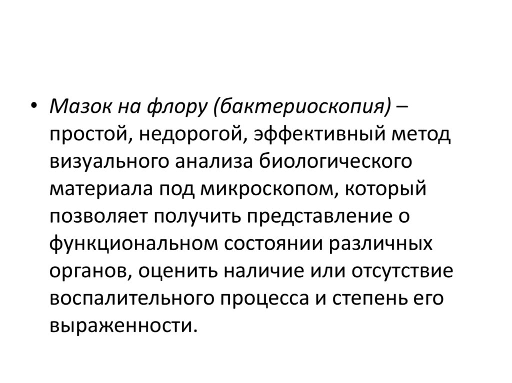 • Мазок на флору (бактериоскопия) –простой, недорогой, эффективный метод