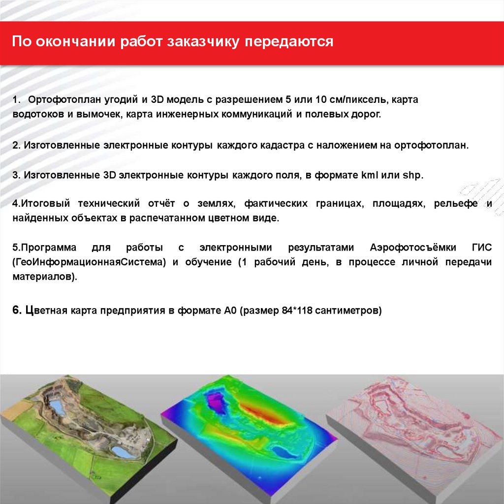 По окончании работ заказчику передаются1. Ортофотоплан угодий и 3D модель с разрешением 5 или 10 см/пиксель, карта