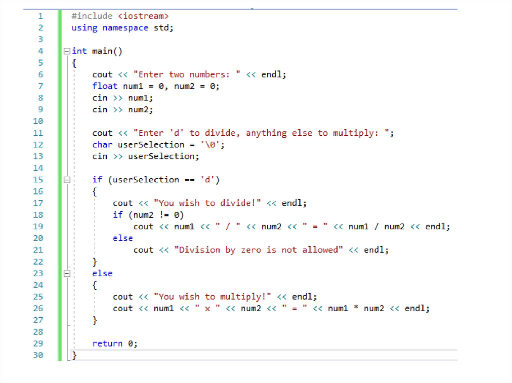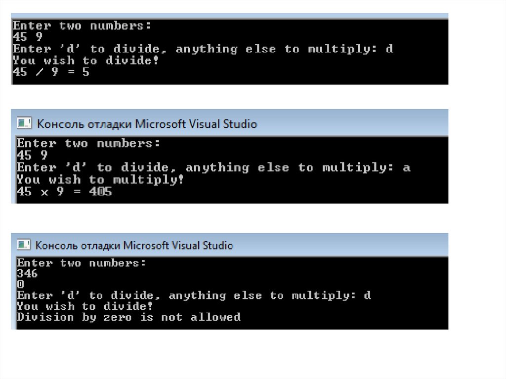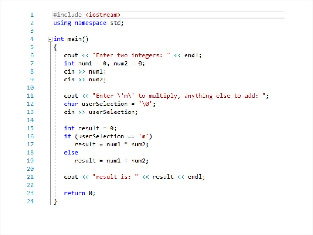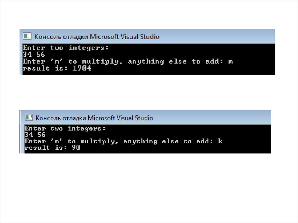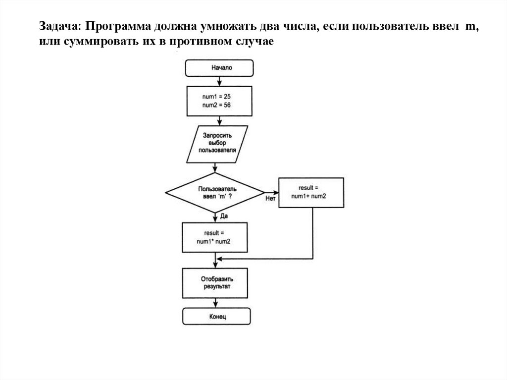 Задача: Программа должна умножать два числа, если пользователь ввел m,или суммировать их в противном случае