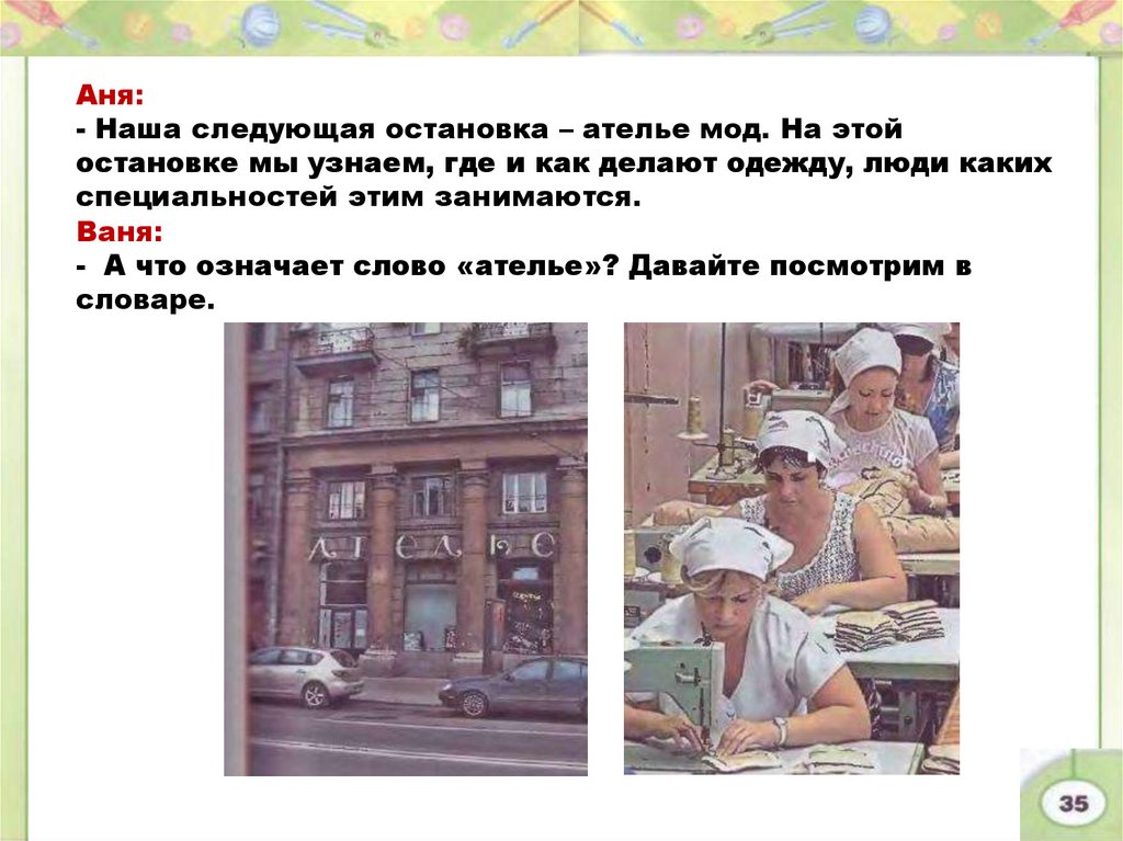 Аня:- Наша следующая остановка – ателье мод. На этой