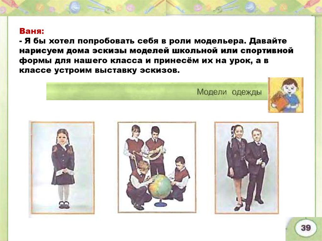 Ваня:- Я бы хотел попробовать себя в роли модельера. Давайте