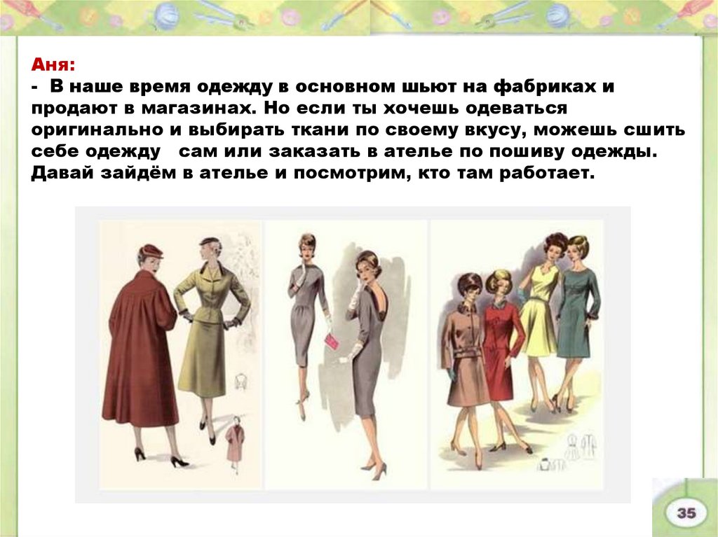 Аня:- В наше время одежду в основном шьют на фабриках и