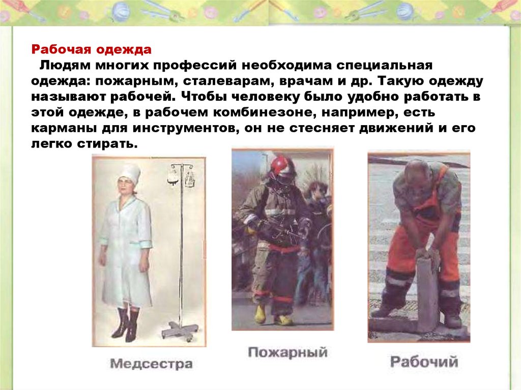 одежда: пожарным, сталеварам, врачам и др. Такую одежду