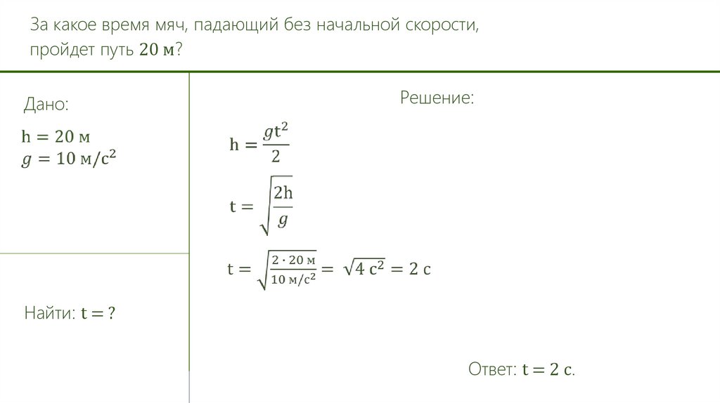 За какое время мяч, падающий без начальной скорости,пройдет путь 20 м?