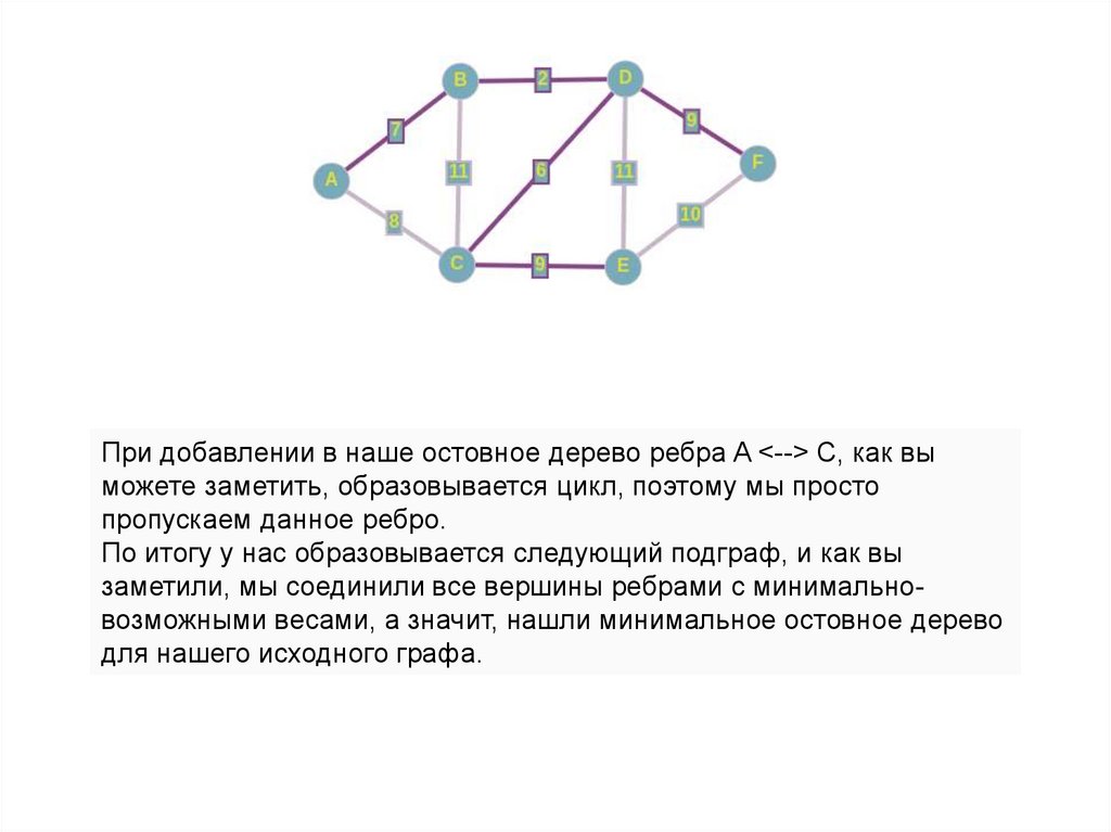 При добавлении в наше остовное дерево ребра A <--> C, как выможете заметить, образовывается цикл, поэтому мы просто