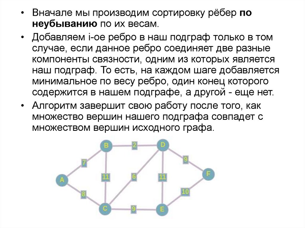 • Вначале мы производим сортировку рёбер понеубыванию по их весам.