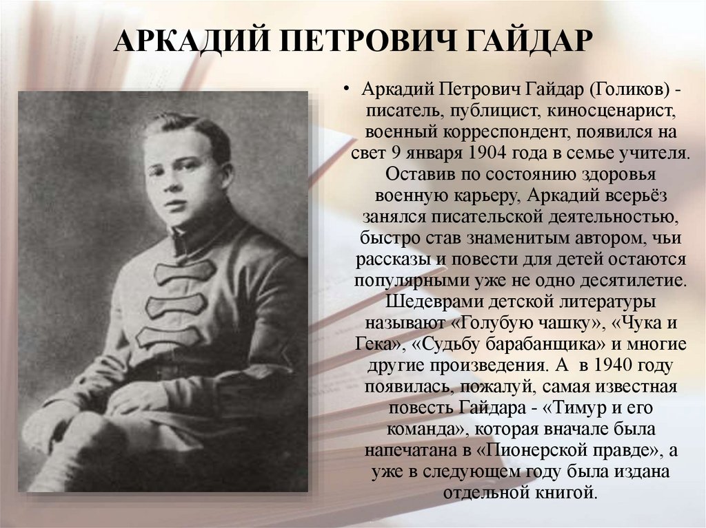 АРКАДИЙ ПЕТРОВИЧ ГАЙДАР• Аркадий Петрович Гайдар (Голиков) писатель, публицист, киносценарист,