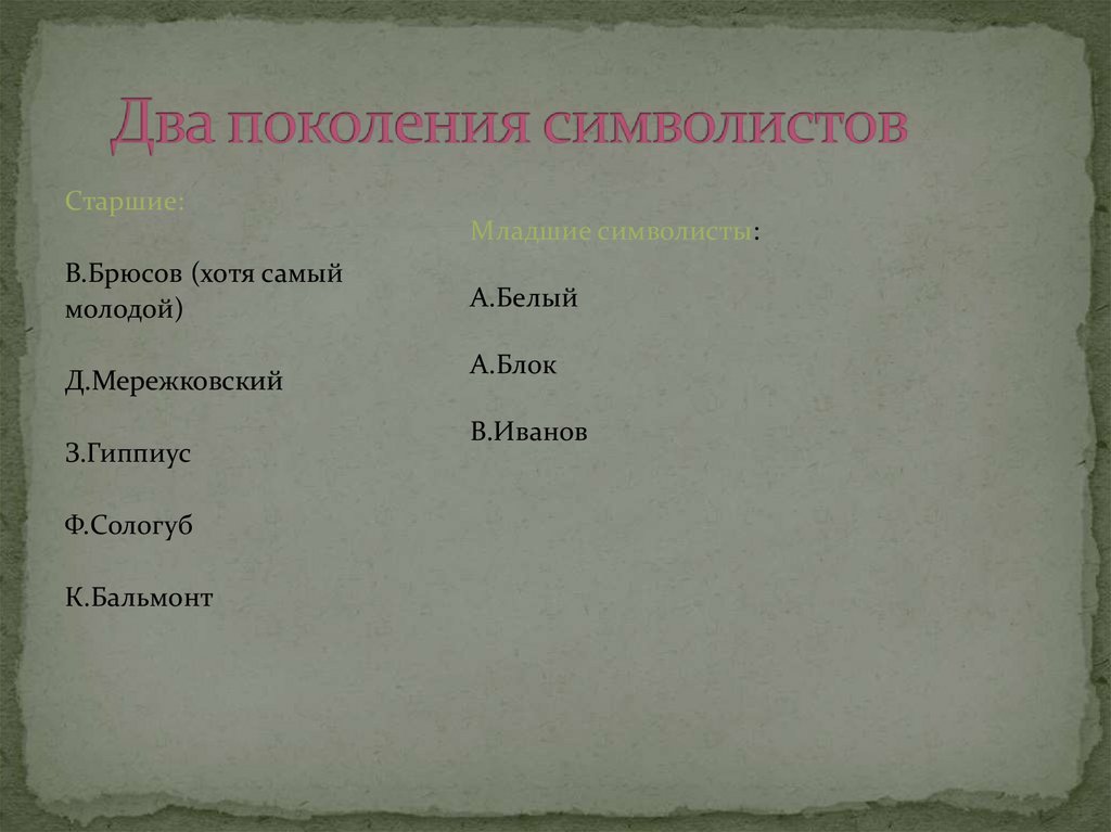 «Русскиесимволисты»Ведущий автор В.Я.БрюсовСоциальные, гражданские