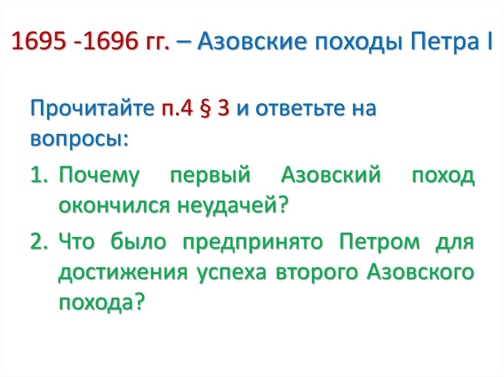 1695 -1696 гг. – Азовские походы Петра IПрочитайте п.4 § 3 и ответьте на