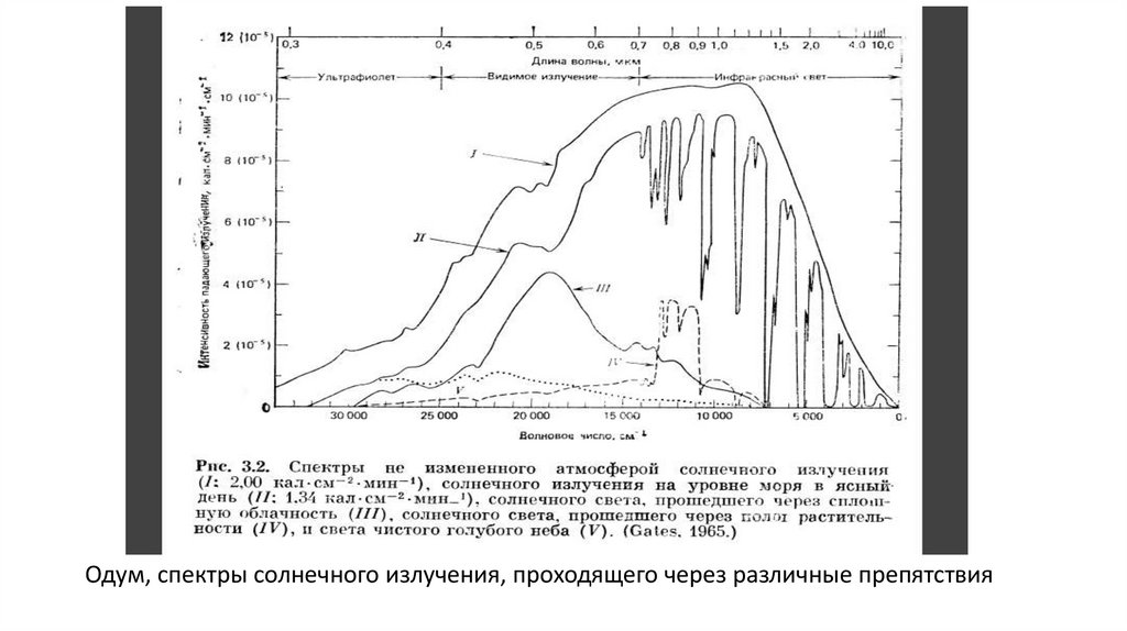 Одум, спектры солнечного излучения, проходящего через различные препятствия5.