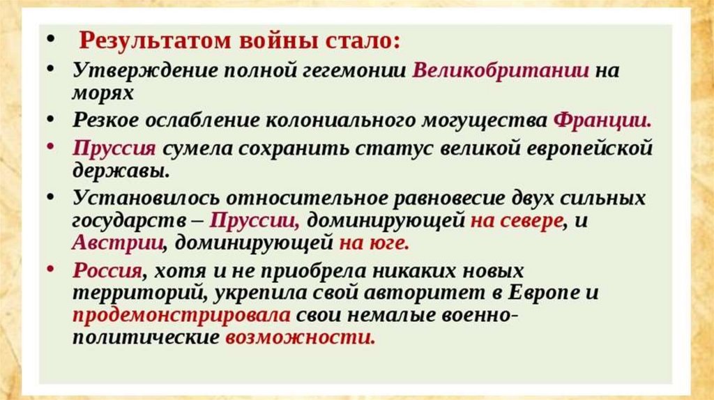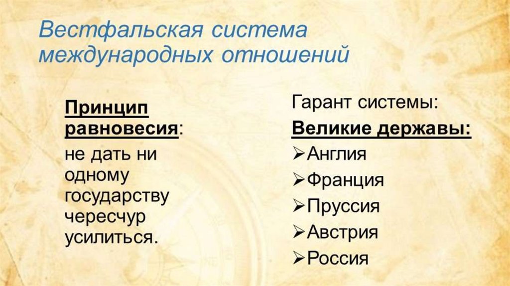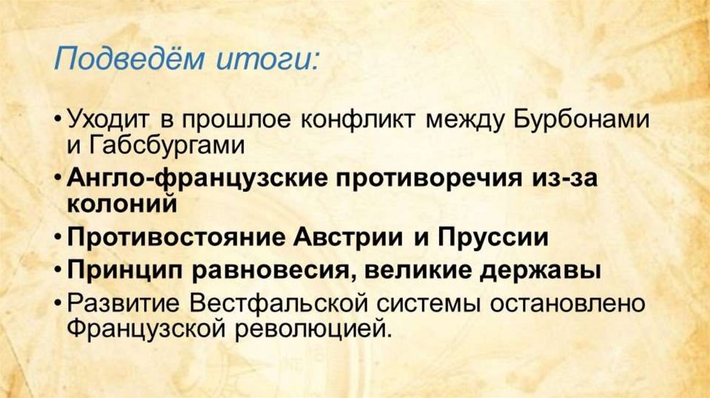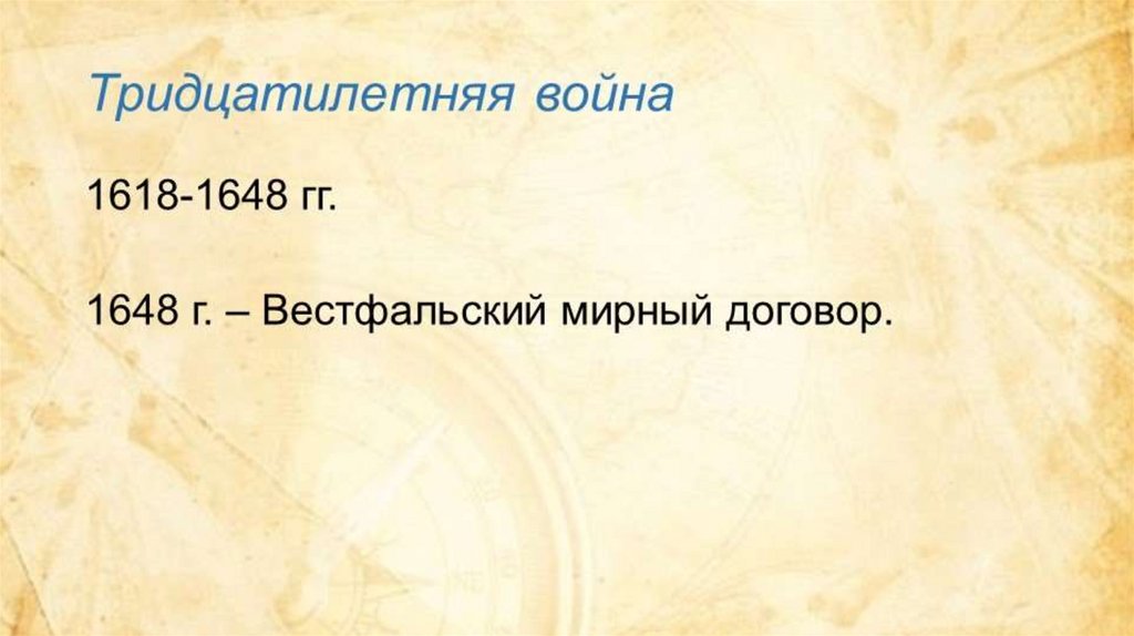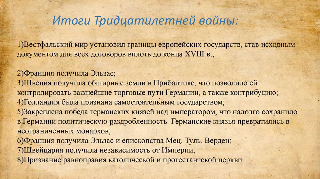 Итоги Тридцатилетней войны:1)Вестфальский мир установил границы европейских государств, став исходным