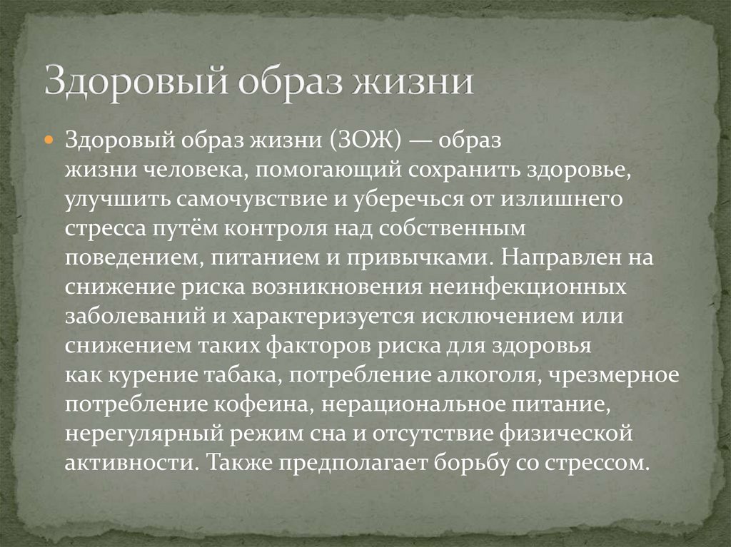 Здоровый образ жизни (ЗОЖ) — образжизни человека, помогающий сохранить здоровье,