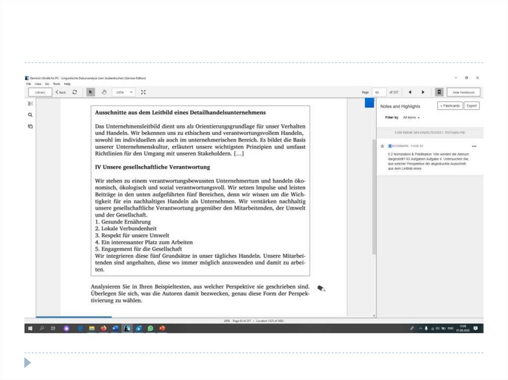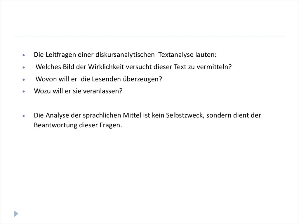 Die Leitfragen einer diskursanalytischen Textanalyse lauten:Welches Bild der Wirklichkeit versucht dieser Text zu vermitteln?