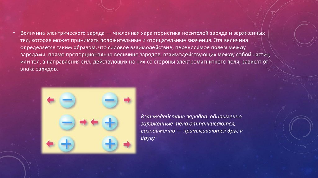 • Величина электрического заряда — численная характеристика носителей заряда и заряженныхтел, которая может принимать положительные и отрицательные значения. Эта величина