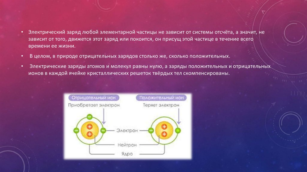 • Электрический заряд любой элементарной частицы не зависит от системы отсчёта, а значит, независит от того, движется этот заряд или покоится, он присущ этой частице в течение всего