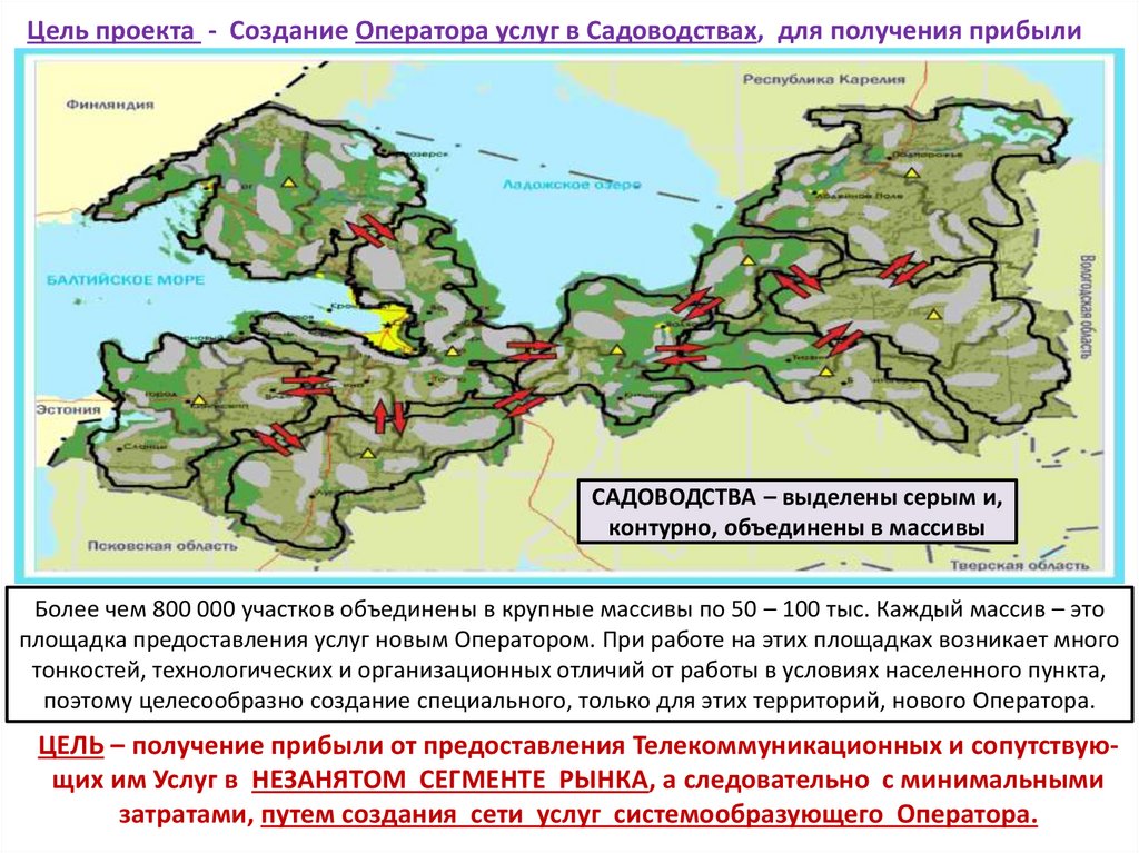 Цель проекта - Создание Оператора услуг в Садоводствах, для получения прибылиСАДОВОДСТВА – выделены серым и,