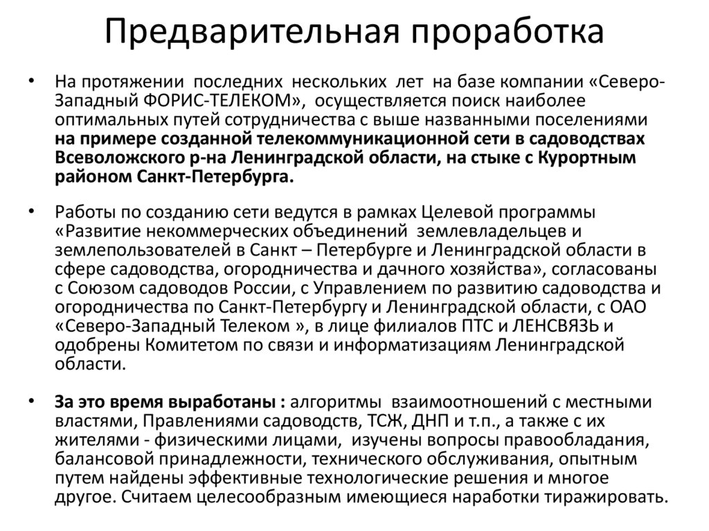 Предварительная проработка• На протяжении последних нескольких лет на базе компании «СевероЗападный ФОРИС-ТЕЛЕКОМ», осуществляется поиск наиболее