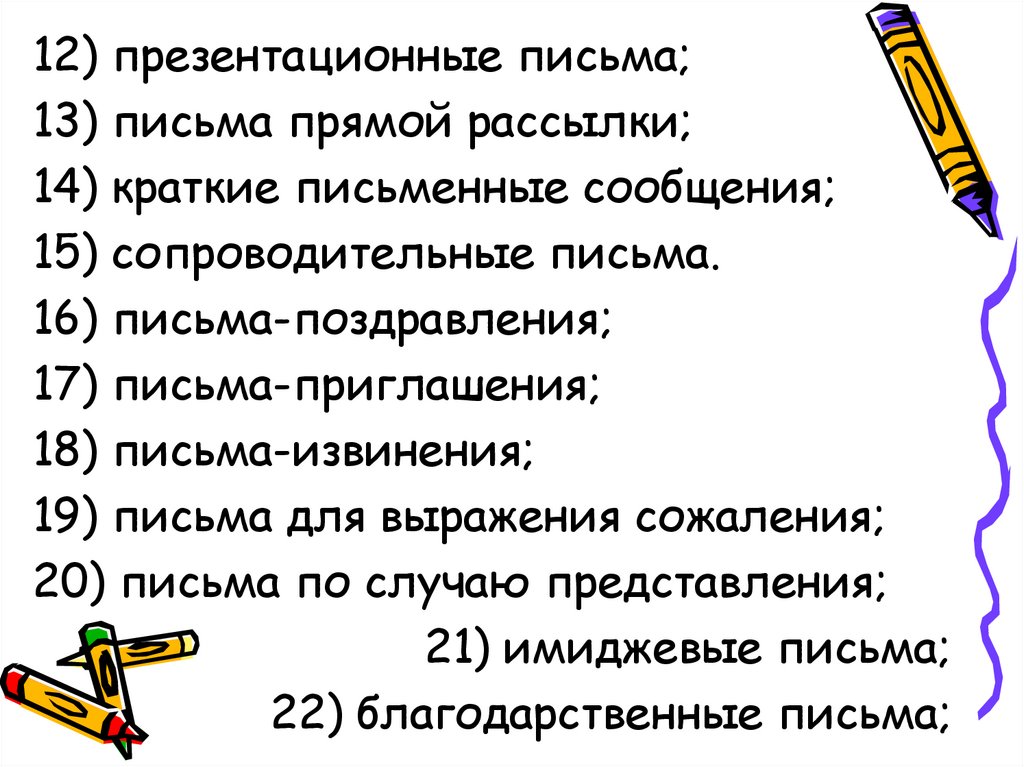 12) презентационные письма;13) письма прямой рассылки;