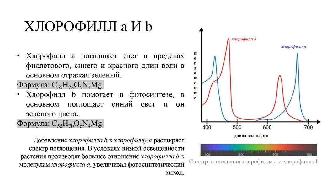 ХЛОРОФИЛЛ a И b• Хлорофилл a поглощает свет в пределах
