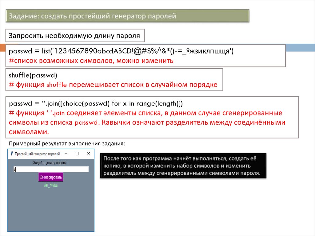 Запросить необходимую длину пароляpasswd = list('1234567890abcdABCD!@#$%^&*()-=_?жзиклпшщя')