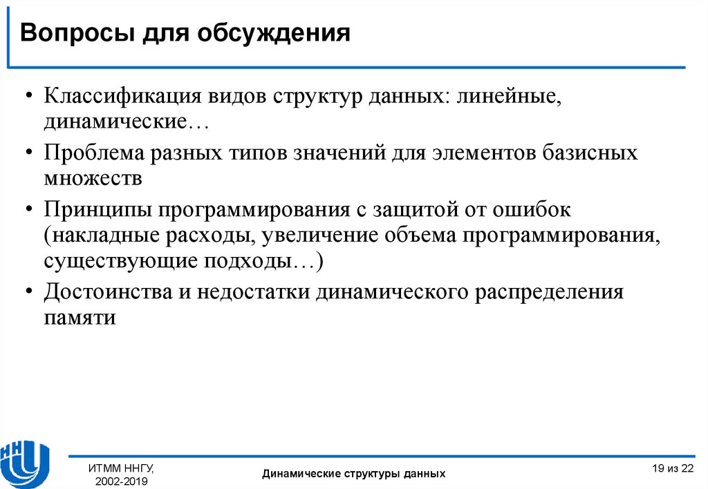 Вопросы для обсуждения• Классификация видов структур данных: линейные,