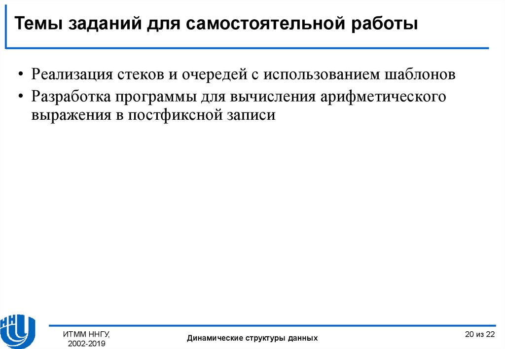 Темы заданий для самостоятельной работы• Реализация стеков и очередей с использованием шаблонов