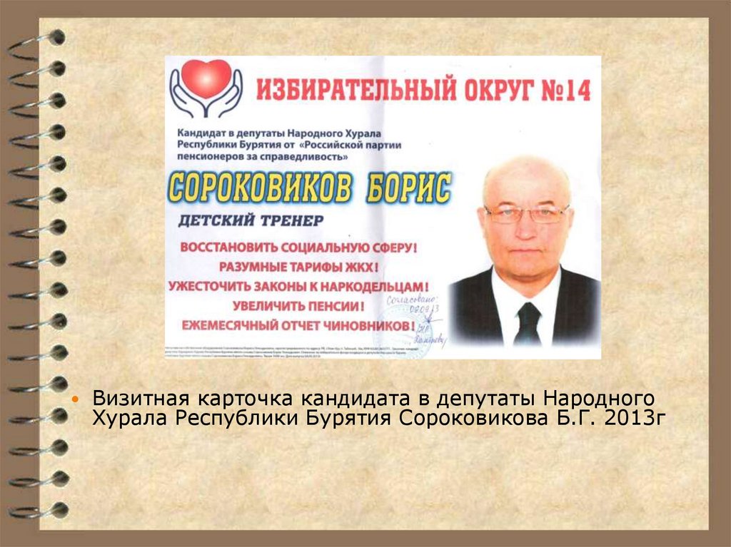 Визитная карточка кандидата в депутаты НародногоХурала Республики Бурятия Сороковикова Б.Г. 2013г