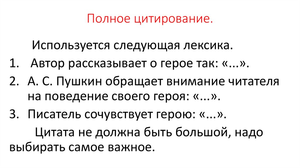 Частичное цитирование.А. С. Пушкин, подчеркивает, что «...»,