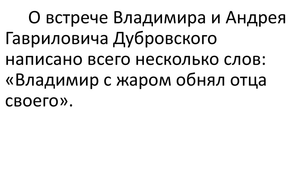 Дубровский говорит Марье Кириловне: «…я тотнесчастный, которого ваш отец лишил куска хлеба, выгнал