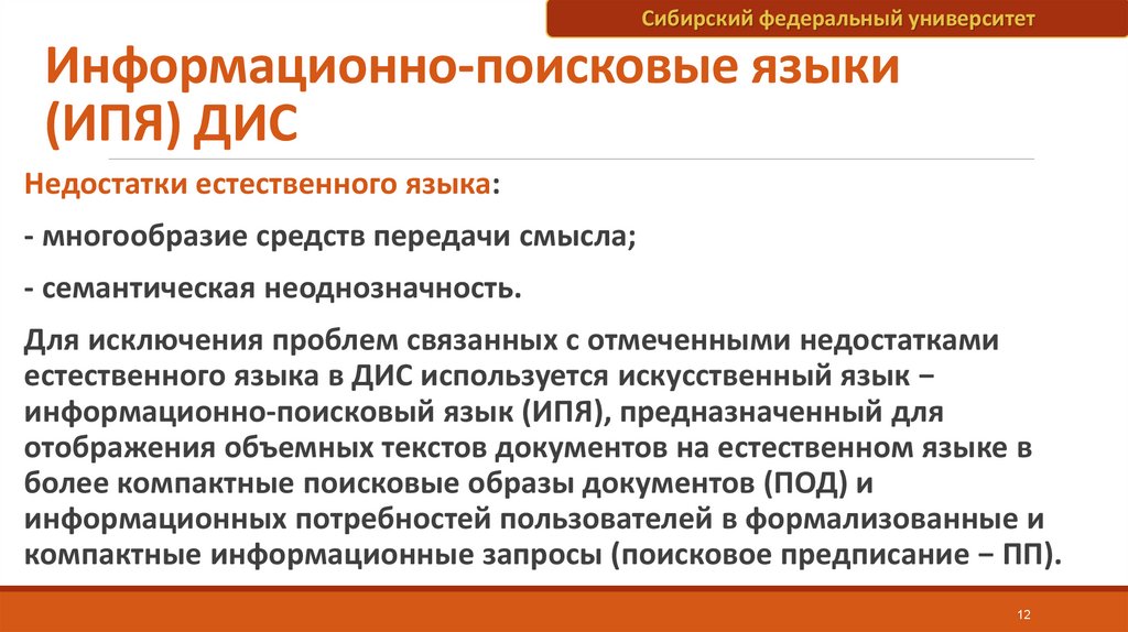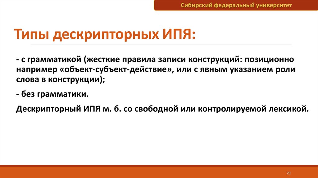 Сибирский федеральный университетТипы дескрипторных ИПЯ: