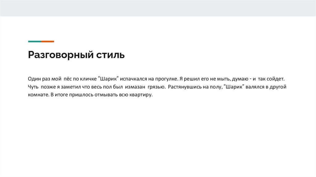 Разговорный стильОдин раз мой пёс по кличке “Шарик” испачкался на прогулке. Я решил его не мыть, думаю - и так сойдет.
