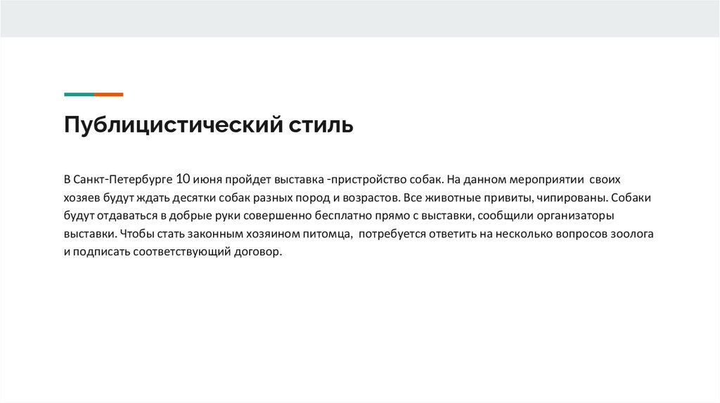 Публицистический стильВ Санкт-Петербурге 10 июня пройдет выставка -пристройство собак. На данном мероприятии своих