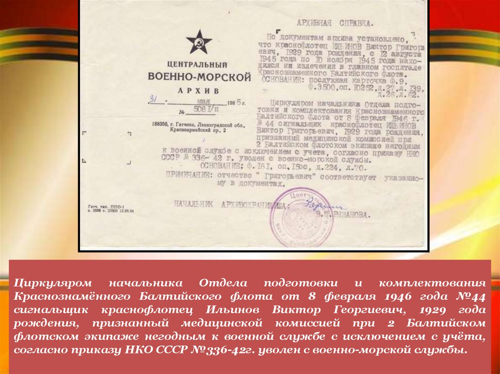 Циркуляром начальника Отдела подготовки и комплектованияКраснознамённого Балтийского флота от 8 февраля 1946 года №44