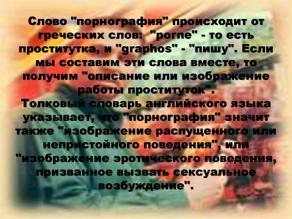 Слово "порнография" происходит отгреческих слов: "porne" - то есть