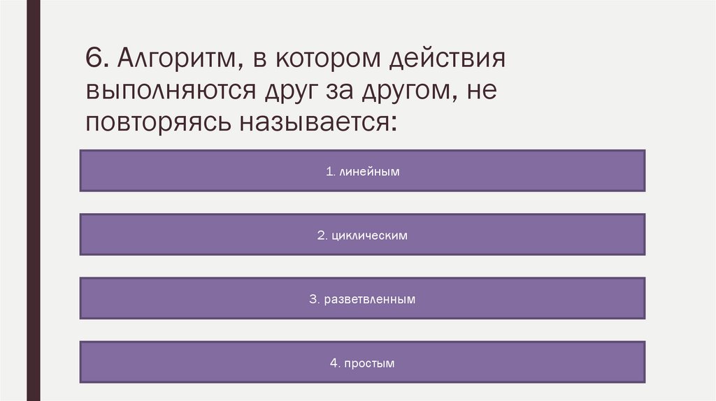 6. Алгоритм, в котором действиявыполняются друг за другом, не