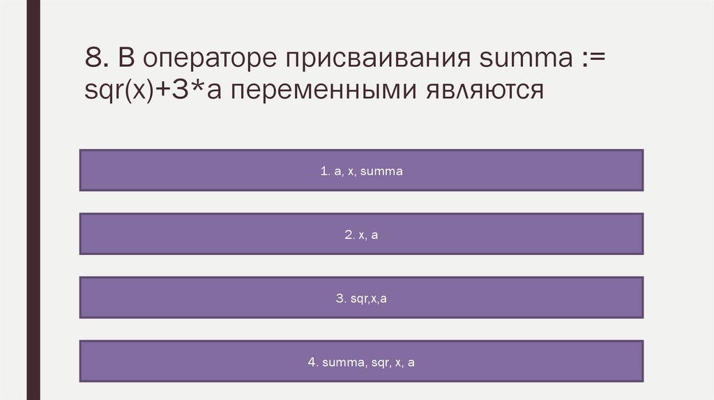8. В операторе присваивания summa :=sqr(x)+3*a переменными являются