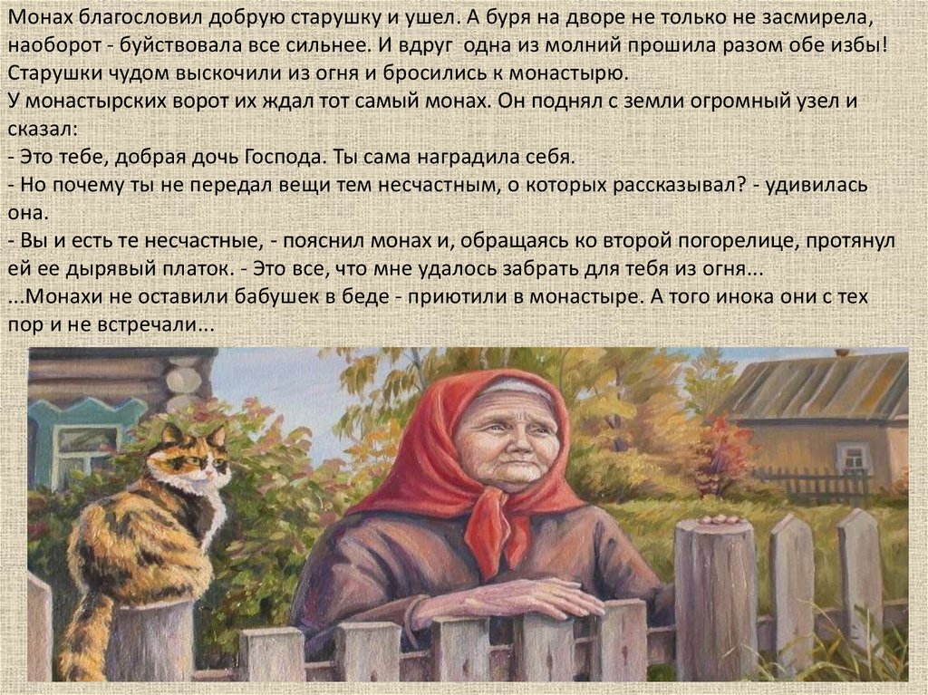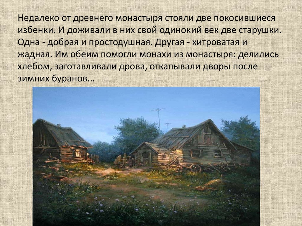 Недалеко от древнего монастыря стояли две покосившиесяизбенки. И доживали в них свой одинокий век две старушки.