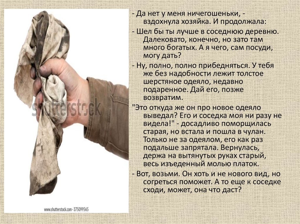 - Да нет у меня ничегошеньки, вздохнула хозяйка. И продолжала:- Шел бы ты лучше в соседнюю деревню.