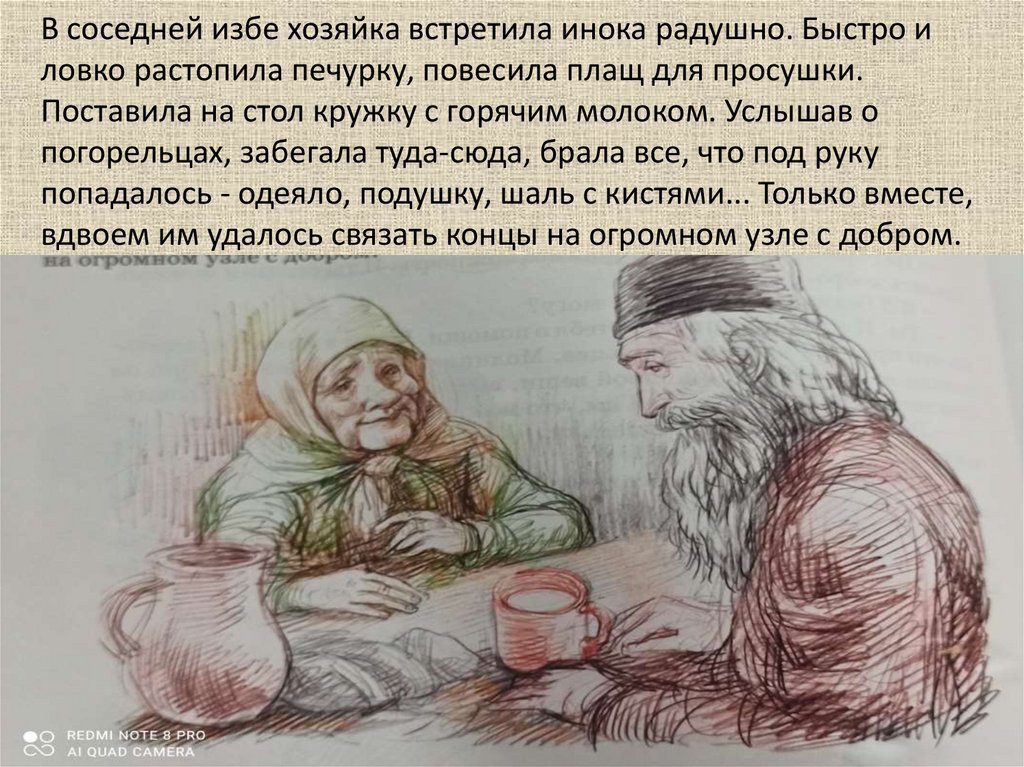 В соседней избе хозяйка встретила инока радушно. Быстро иловко растопила печурку, повесила плащ для просушки.