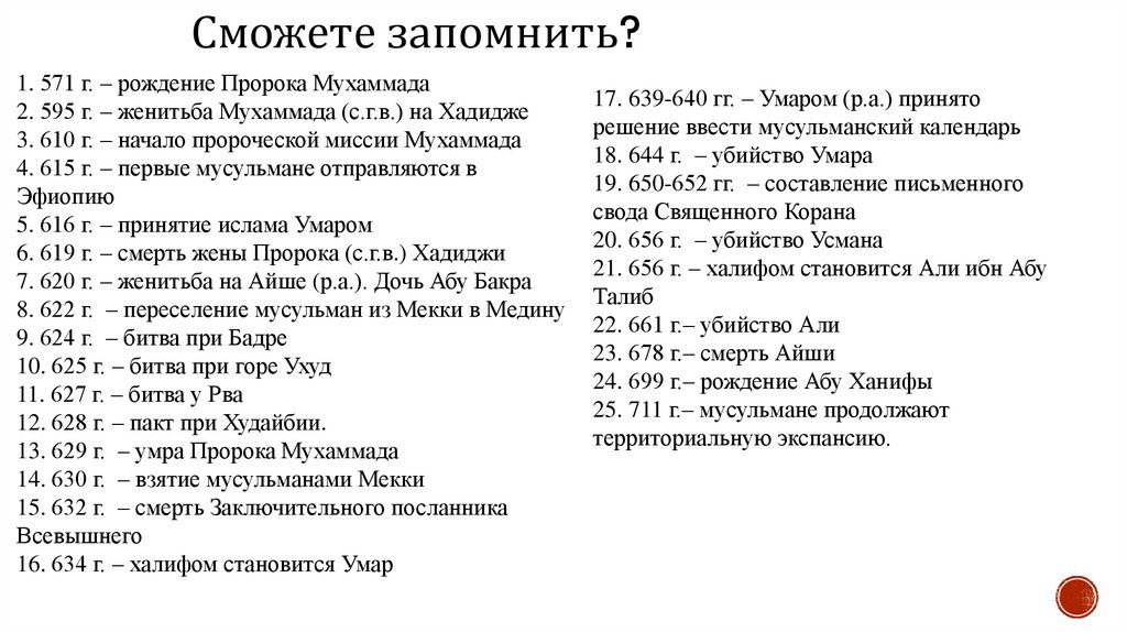 Сможете запомнить?1. 571 г. – рождение Пророка Мухаммада