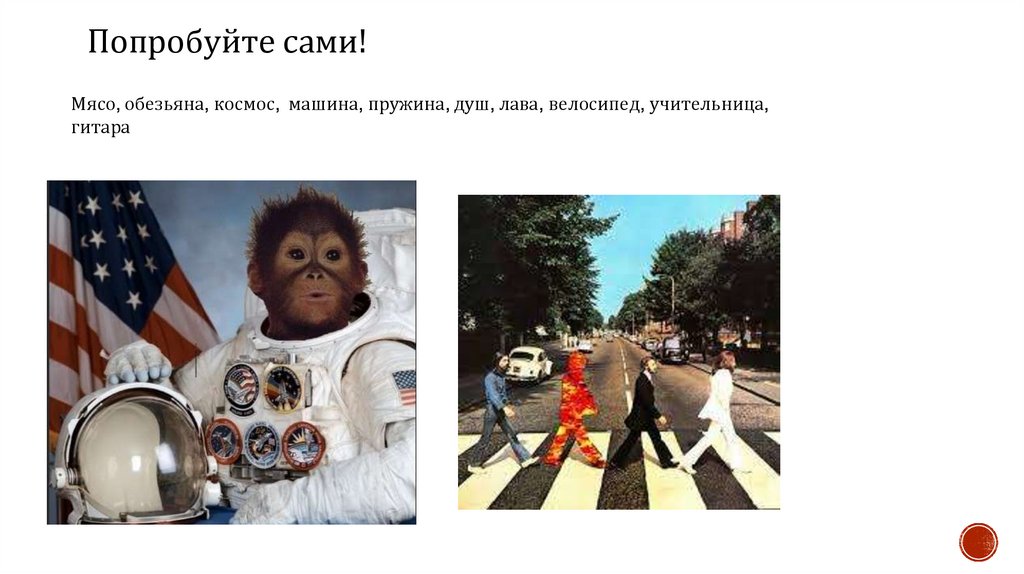 Попробуйте сами!Мясо, обезьяна, космос, машина, пружина, душ, лава, велосипед, учительница,