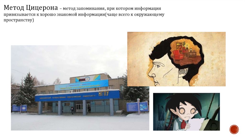 Метод Цицерона – метод запоминания, при котором информацияпривязывается к хорошо знакомой информации(чаще всего к окружающему
