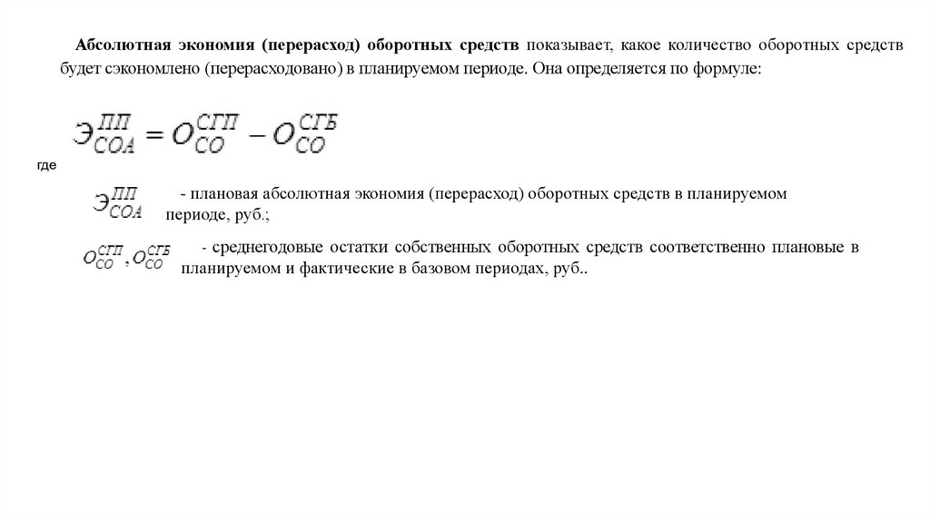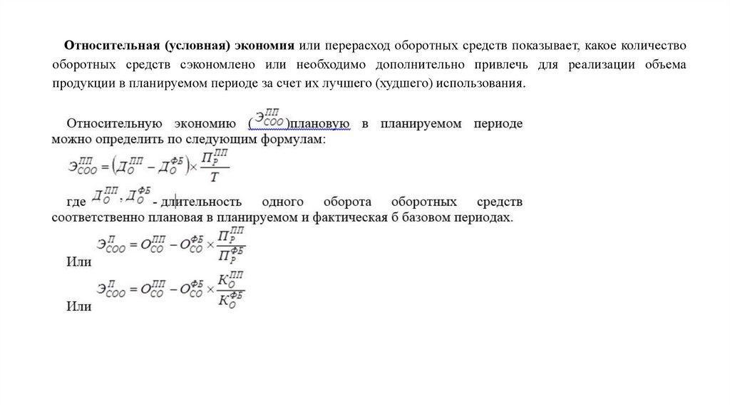 Различают абсолютную и относительную (условную) экономию или перерасход оборотных средств.