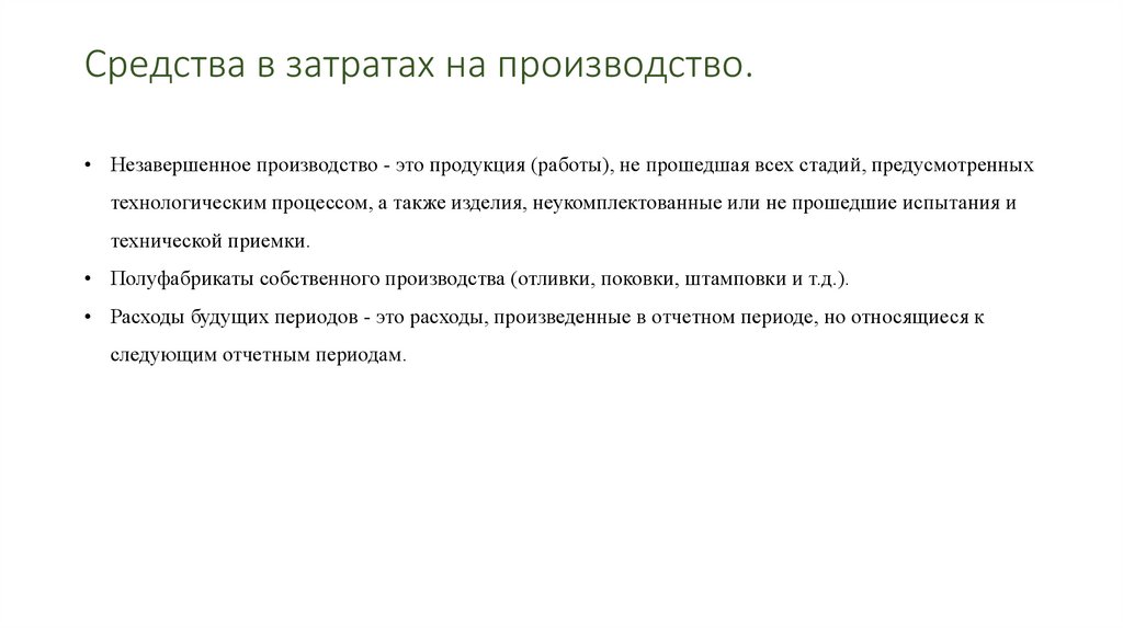 Средства в затратах на производство.• Незавершенное производство - это продукция (работы), не прошедшая всех стадий, предусмотренных